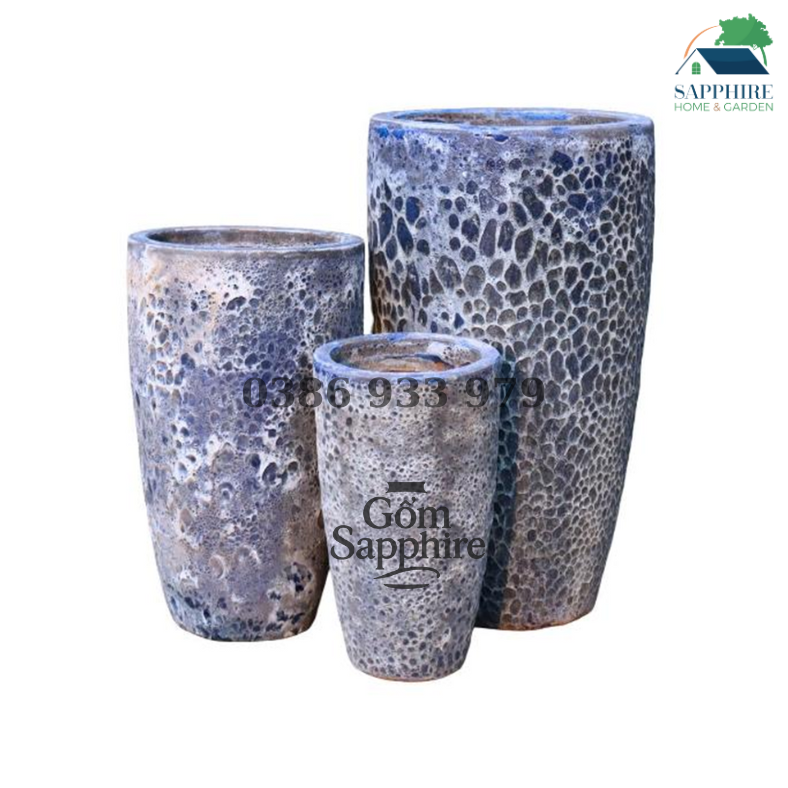 Sở hữu vẻ đẹp mộc mạc nhưng không kém phần tinh tế, bộ chậu gốm men xanh xám họa tiết bọt đá mang đến cảm giác an nhiên và sang trọng cho không gian sống. Lớp men hiệu ứng sôi tự nhiên tạo nên những hoa văn loang đậm – nhạt đầy ngẫu hứng, như bề mặt đá núi bị gió và thời gian bào mòn, mang đậm tinh thần rustic – tự nhiên – chân thật.