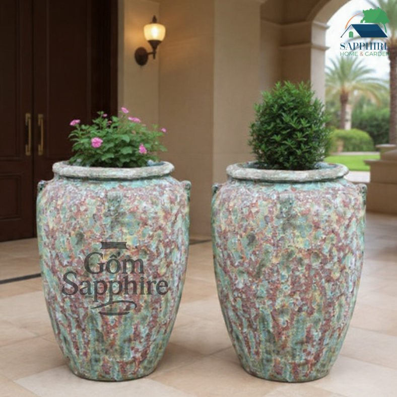 Phong cách thiết kế hiện đại pha trộn cổ điển giúp bộ chậu dễ dàng hòa hợp với nhiều không gian: sân vườn, ban công, khu nghỉ dưỡng, homestay hay các công trình cảnh quan cao cấp. Chất liệu gốm nung bền chắc, chịu thời tiết tốt, thích hợp cho cả trong nhà và ngoài trời.