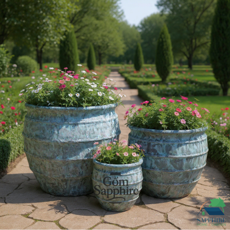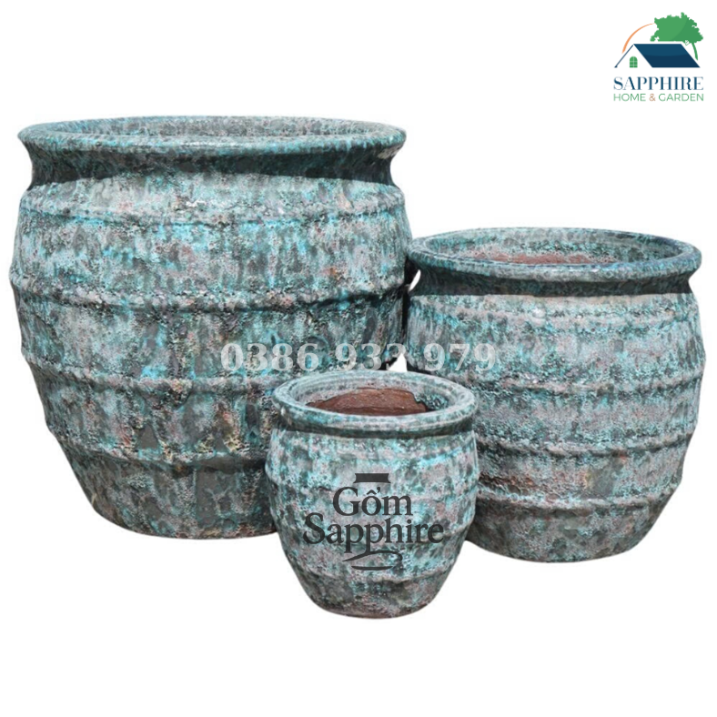 Bộ chậu cảnh men xanh cổ gồm 3 kích thước khác nhau, được chế tác thủ công từ gốm sứ cao cấp. Mỗi chiếc chậu mang lớp men xanh ngọc rêu đặc trưng, tạo hiệu ứng cổ điển, sang trọng và tự nhiên. Đây là lựa chọn hoàn hảo để trồng các loại cây cảnh, bonsai, hoặc làm điểm nhấn trong sân vườn, ban công, hay không gian nội thất.