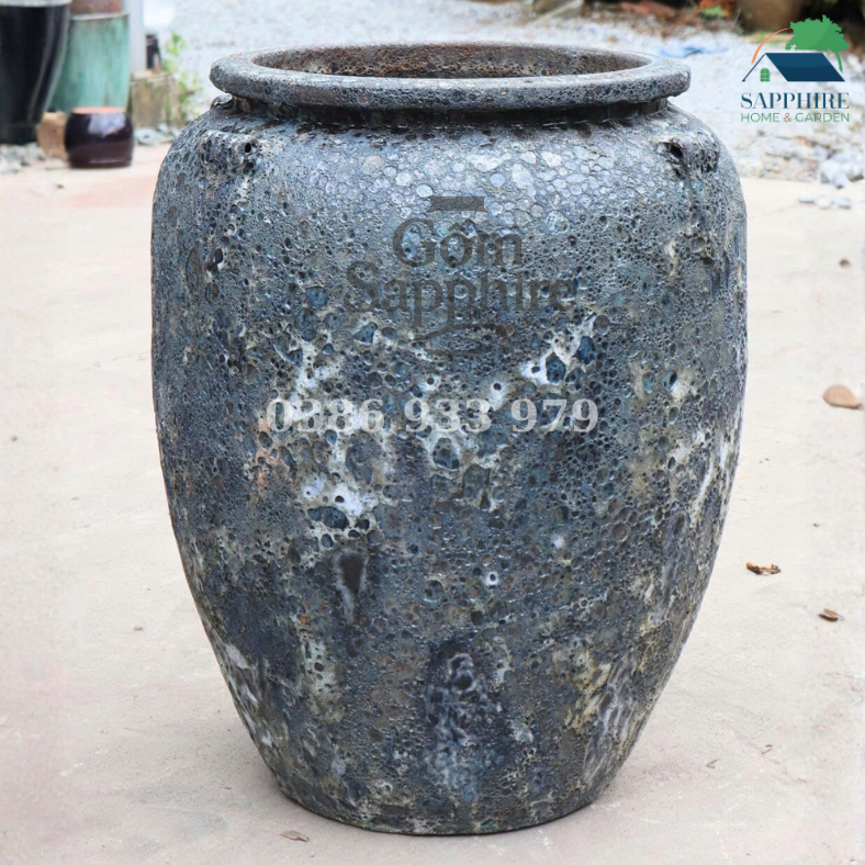 Kết cấu sần tự nhiên cùng những vệt men loang mềm mại giúp mỗi chiếc chậu đều mang cá tính riêng, không chiếc nào giống chiếc nào – đúng chất của dòng gốm nghệ thuật thủ công cao cấp. Dáng chậu bầu tròn chắc khỏe, miệng dày tạo cảm giác vững chãi và dễ dàng kết hợp với nhiều loại cây cảnh: cây bụi, cây tán thẳng, cây kiểng sân vườn hoặc trồng độc lập làm điểm nhấn décor.