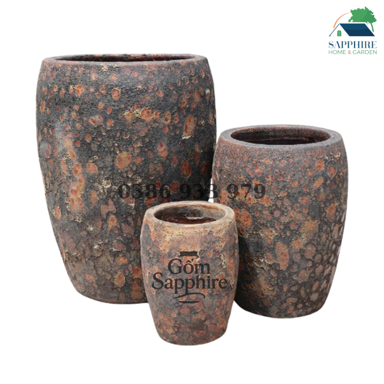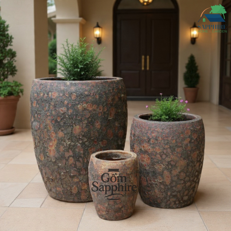 • Hiệu ứng men phong hóa độc đáo: Mỗi chiếc chậu như một tác phẩm nghệ thuật riêng biệt, với bề mặt loang màu tự nhiên, không chậu nào giống chậu nào.
