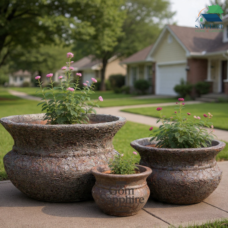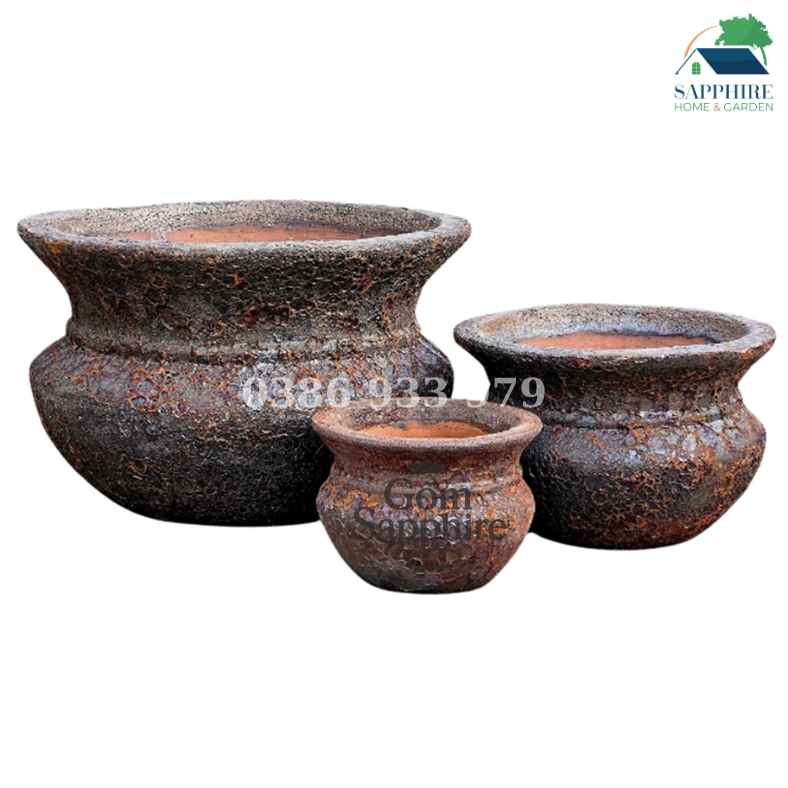 Bộ chậu gốm nghệ thuật Rustic gồm 3 kích thước khác nhau, được làm thủ công từ đất nung cao cấp với lớp men giả cổ độc đáo. Bề mặt chậu được xử lý tạo hiệu ứng nứt rạn tự nhiên, kết hợp cùng tông màu nâu đen mộc mạc, mang đến vẻ đẹp giàu tính thẩm mỹ và cổ điển.
