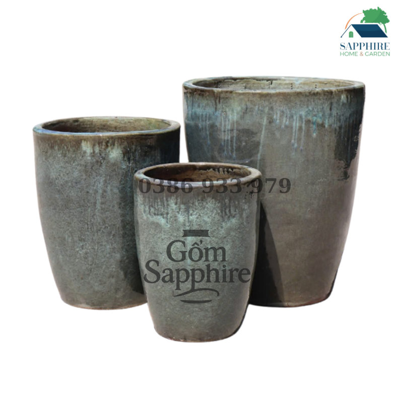 Chậu gốm men Moss Green gây ấn tượng với tông xanh rêu trầm kết hợp hiệu ứng loang men tự nhiên và các vệt chảy nhẹ, tạo chiều sâu sang trọng, mộc mạc nhưng vẫn rất hiện đại. Bề mặt men mịn, màu sắc dịu mắt, dễ phối với nhiều phong cách sân vườn và kiến trúc từ tối giản đến resort cao cấp.