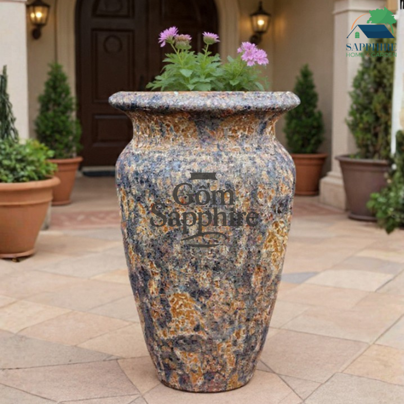Chậu gốm Rustic mang vẻ đẹp mộc mạc, trầm ấm và đậm chất tự nhiên, được tạo nên bởi lớp men hiệu ứng giả cổ với các mảng màu loang độc đáo. Sự hòa quyện giữa gam nâu đất, xám tro và những điểm nhấn rỉ sét tạo nên một bề mặt chân thật như được bào mòn theo thời gian – nét đẹp đặc trưng của phong cách Rustic.
