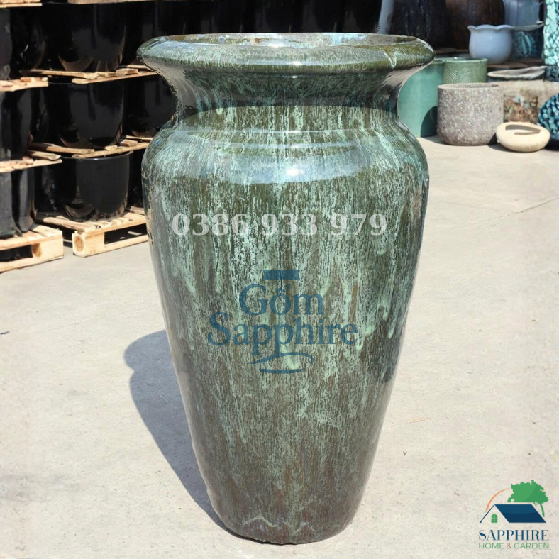 Chậu gốm màu rêu cổ gây ấn tượng với lớp men xanh rêu đậm chất cổ điển, được xử lý theo kỹ thuật men chảy tạo hiệu ứng loang mềm mại và tự nhiên. Sự hòa quyện giữa các tông xanh, nâu và rêu phong giúp bề mặt chậu mang vẻ đẹp của sự thời gian, phù hợp hoàn hảo với phong cách sân vườn mộc mạc, cổ điển hoặc resort cao cấp.
