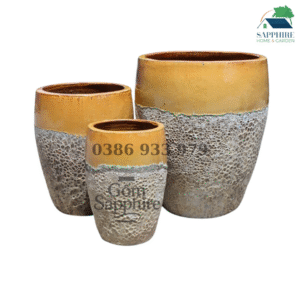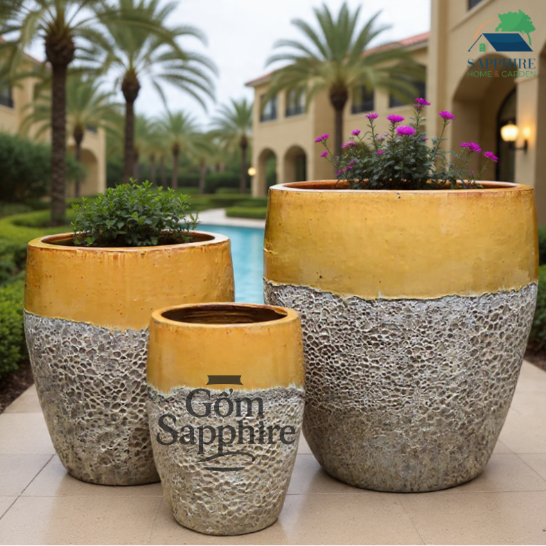 Mỗi chiếc chậu được làm thủ công từ gốm cao cấp, phủ men vàng bóng mịn, sau đó nung ở nhiệt độ cao giúp bền màu, chống thấm nước và chịu được thời tiết khắc nghiệt. Bộ gồm 3 kích thước khác nhau, phù hợp để trồng cây cảnh, bonsai hoặc dùng làm điểm nhấn trang trí trong nhà, sân vườn, ban công hay quán cà phê.