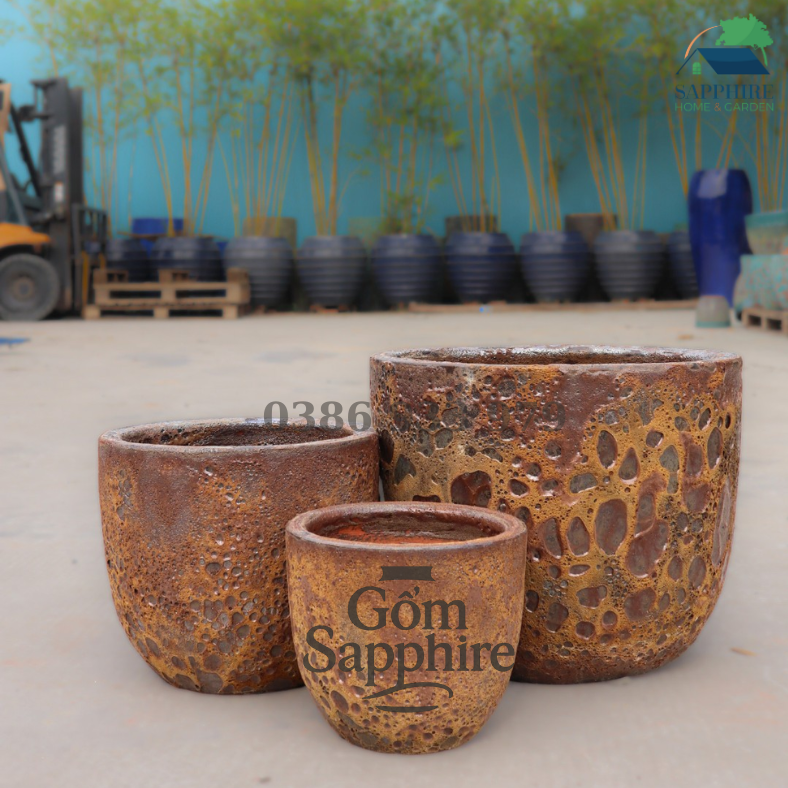 Mẫu chậu trứng men sôi socola nổi bật với gam màu nâu socola trầm ấm, kết hợp những mảng màu vàng đất – nâu đỏ loang tự nhiên tạo nên chiều sâu và sự chuyển sắc tinh tế. Lớp men sôi đặc trưng tạo nên vô số hốc nhỏ dạng tổ ong phủ khắp bề mặt, mang lại vẻ đẹp thô mộc nhưng vẫn vô cùng nghệ thuật.