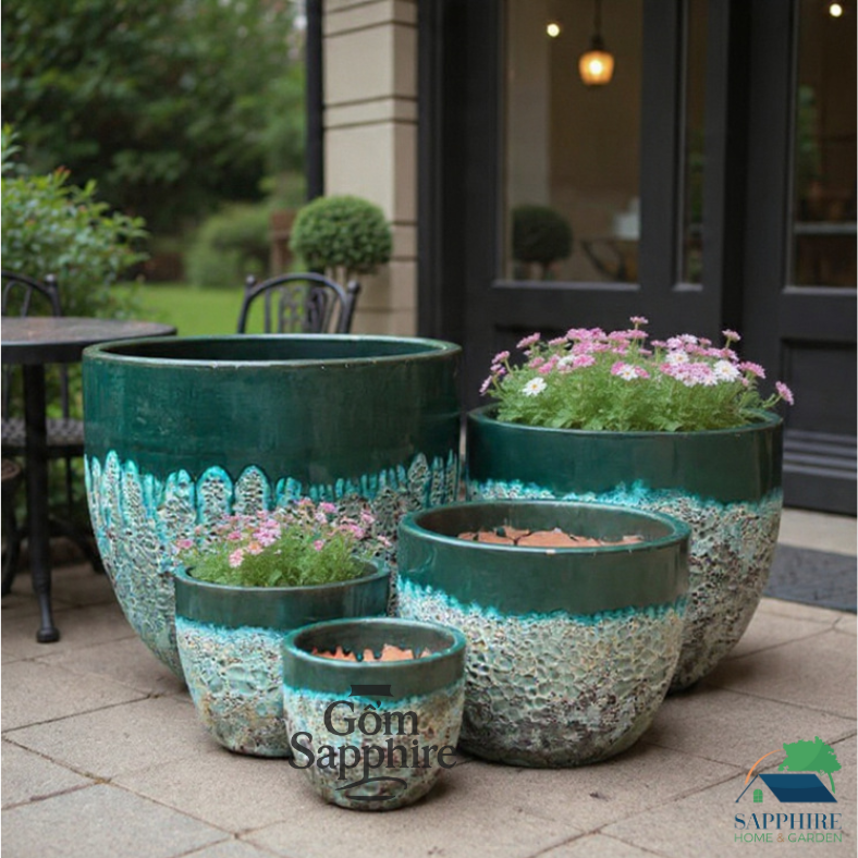 Sản phẩm được làm thủ công tại làng gốm Bình Dương, qua quá trình nung ở nhiệt độ trên 1200°C, giúp chậu có độ cứng cao, chống thấm và chịu được thời tiết khắc nghiệt. Màu men xanh rêu kết hợp hài hòa giữa sắc ngọc lam và nâu đất, tạo điểm nhấn nổi bật cho cây trồng và tổng thể không gian.