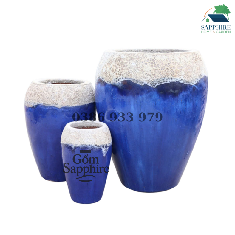 Bộ chậu gốm men xanh nổi bật với gam màu xanh sâu quyến rũ, gợi cảm giác tươi mát và tràn đầy năng lượng như sắc nước biển. Điểm nhấn ấn tượng nhất của sản phẩm nằm ở phần miệng chậu phủ lớp men bong bóng độc đáo – hiệu ứng tạo bề mặt sủi nhẹ, tự nhiên và mang tính nghệ thuật cao.