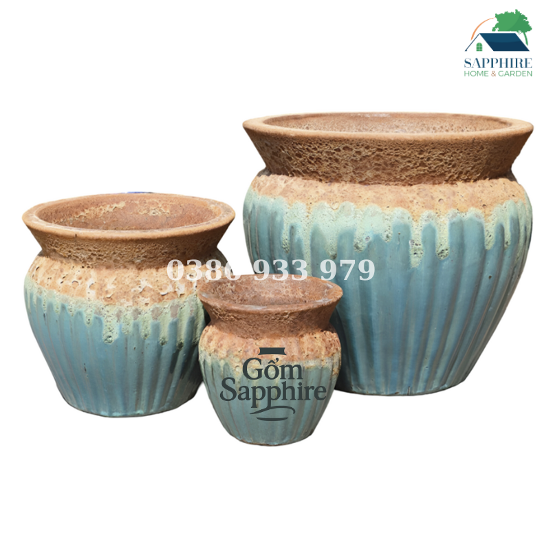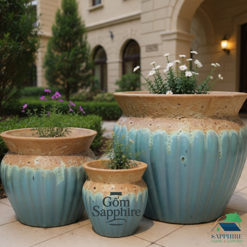Tôn vinh vẻ đẹp giao hòa giữa tự nhiên và nghệ thuật thủ công, Bộ Chậu Gốm Men Chảy Xanh Cổ Điển mang đến cảm giác bình yên, tinh tế cho mọi không gian sống. Sản phẩm được phủ lớp men chảy độc đáo, kết hợp hài hòa giữa gam xanh ngọc mát dịu và sắc nâu đất mộc mạc, tạo hiệu ứng chuyển màu mềm mại như dòng men tan chảy trên bề mặt gốm.